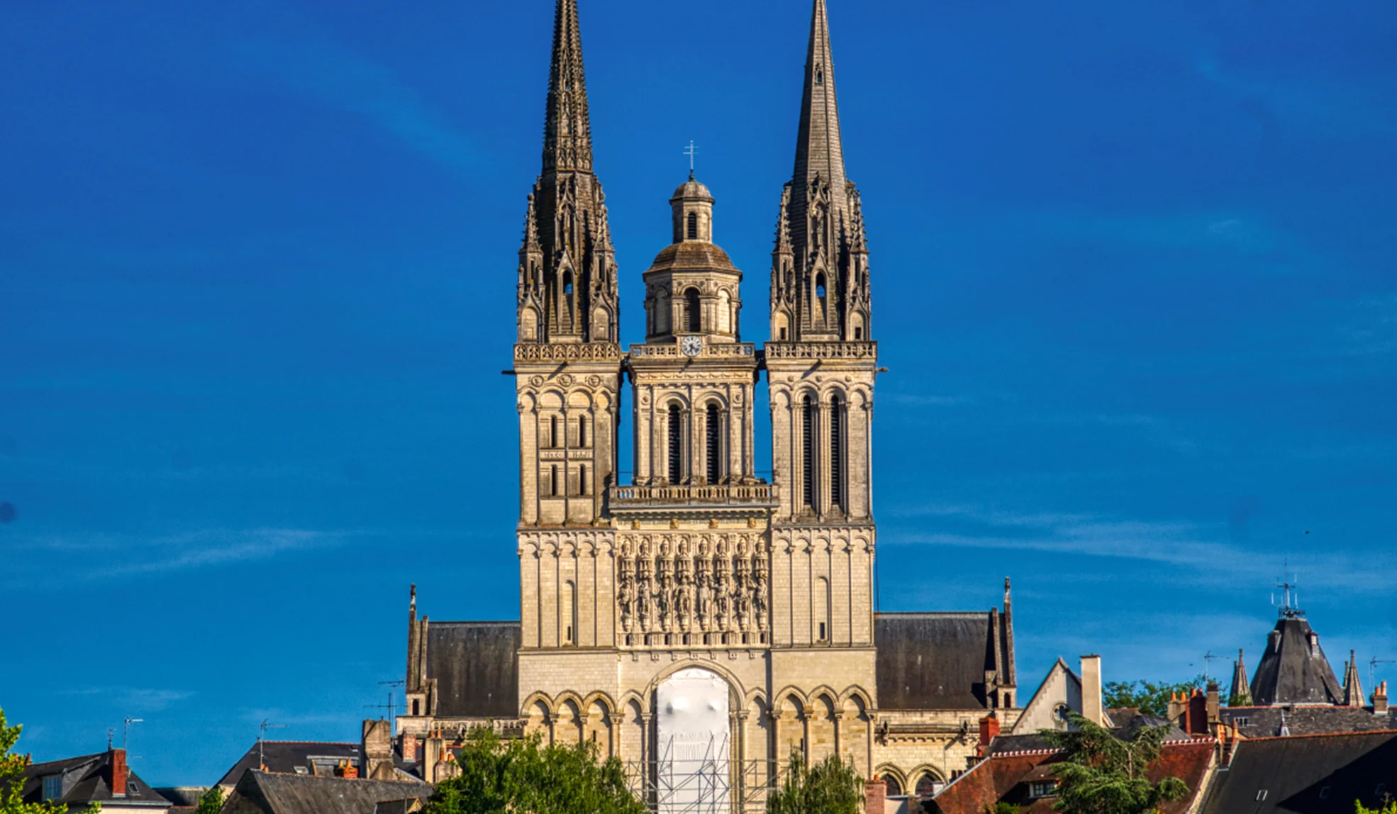 Angers Cathedral (Cathédrale Saint-Maurice d'Angers) stands proudly in Angers, France. The cathedral serves as the seat of the Bishops of Angers and is dedicated to Saint Maurice. Built between the 11th and 16th centuries, the cathedral mixes Romanesque and Gothic architecture, reflecting the historical changes in design during its construction.